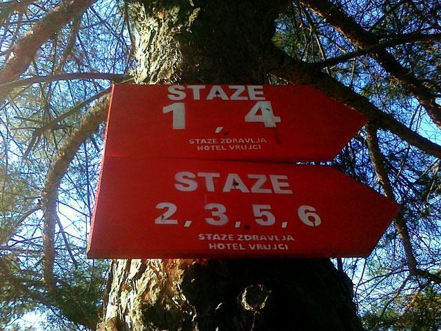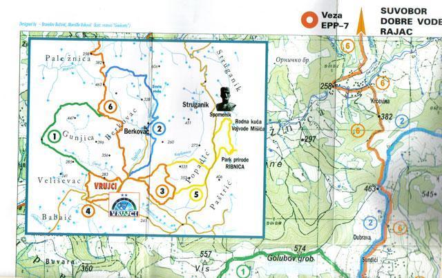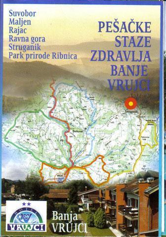 TRAIL OF LOVE 2 - Izvori - Pavlovića kosa - Šundići - Berkovačka glavica - Izvor Sveta voda - Ignjatovići - Radojičići - Berkovac - Dubrava - Berkovačka reka - Izvori - Hotel "Vrujci", HERITAGE TRAIL - Hotel "Vrujci" - Izvori - Most - Rosulje - Kamalj - Petrovići - Park prirode Ribnica (Paštrić) - Đačka staza - Rodna kuća vojvode Mišića - Petkovača - Popadić - Tomići - Kopljanica - Krstići - Most - Izvori - Hotel "Vrujci", BANJA VRUJCI WALK - Hotel "Vrujci" - Izvori - Potok Gerić - Krstovo brdo - Pantići - Gornja Toplica - Crkva - Kej Toplice - Hotel "Vrujci" BANJA VRUJCI WALK 2 - Hotel "Vrujci" - Izvori - Most - Rosulja - Škola u Popadiću - Groblje - Ceroviti vrh - Kopljanica - Krstići - Most - Izvor - Hotel "Vrujci" MOUNTAIN WAY TO SUVOBOR - Hotel "Vrujci" - Pavlovića kosa - Šundići - Paležnica - Rajac. This is the path for hiking trails which is binding Suvobor, Ravna Gora and Rajac. This trail is also a reference to European pedestrian trail "E7", which moves along the Valjevo mountains Maljen, Suvobor, Rajac and Rudnik. The trail is marked with a logo as a red circle with a white field in the middle. Note: You can buy a printed map of walking trails in the hotel "Vrujci" at a price of 99 dinars